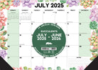 SUCCULENT SERENITY - Robust rosettes cluster and grow along the border of the Succulents Academic 17" x 12" Desk pad Calendar. Gradients of cool blues, jaded chartreuse, blush pinks, and soothing purples highlight the zen-like symmetry of these stunning plants to create a serene, everlasting garden for the July 2025 to June 2026 academic year.
