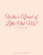 YOU SHOULD BE – Let your confidence shine with the Who's Afraid Academic Monthly Planner. Covering July 2025 to June 2026, this 7.5" x 9.5" planner is perfect for taking on the world—one month at a time. With a demure petal pink cover, this planner reminds us that while you may feel small, your impact is mighty.