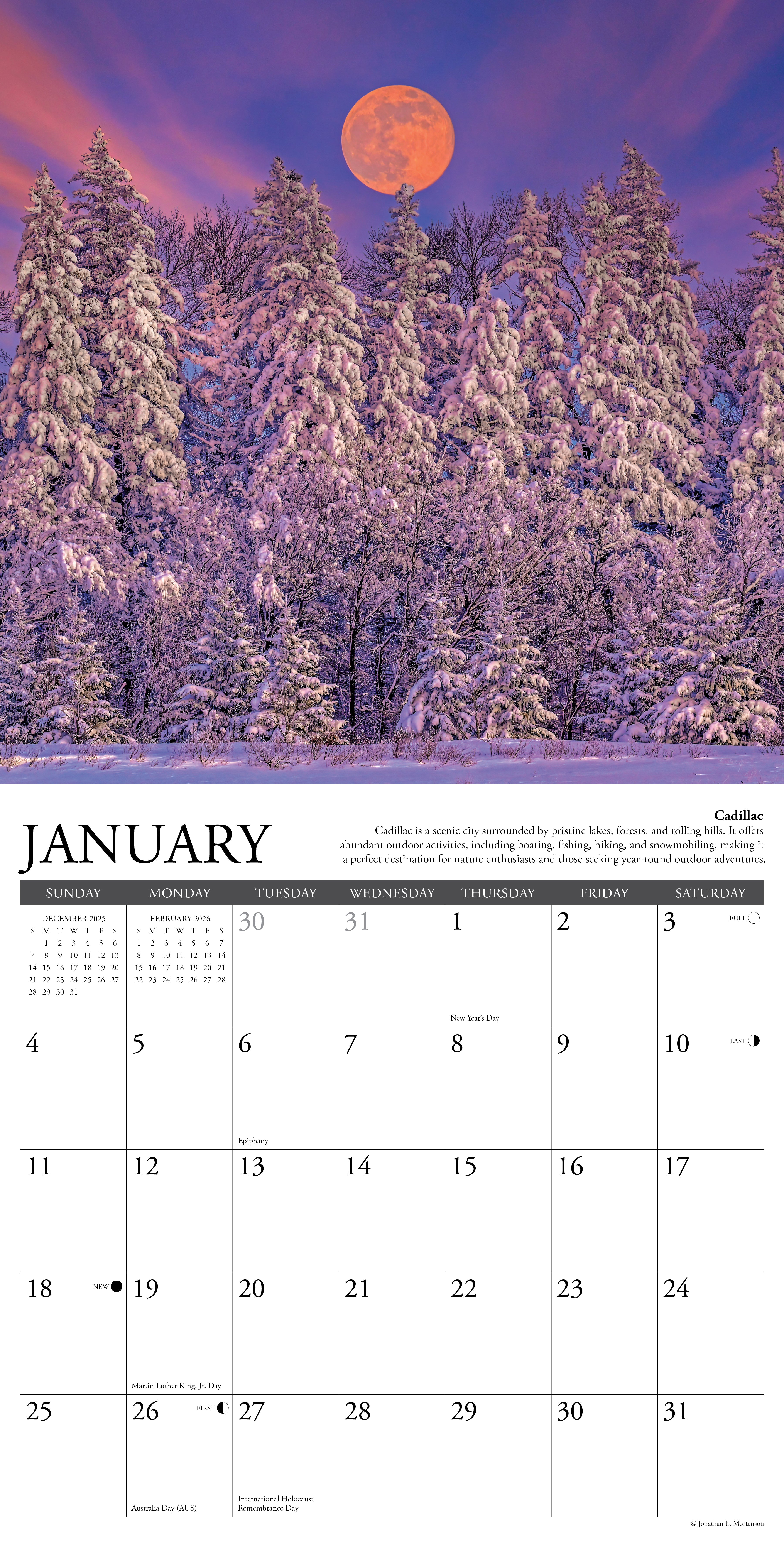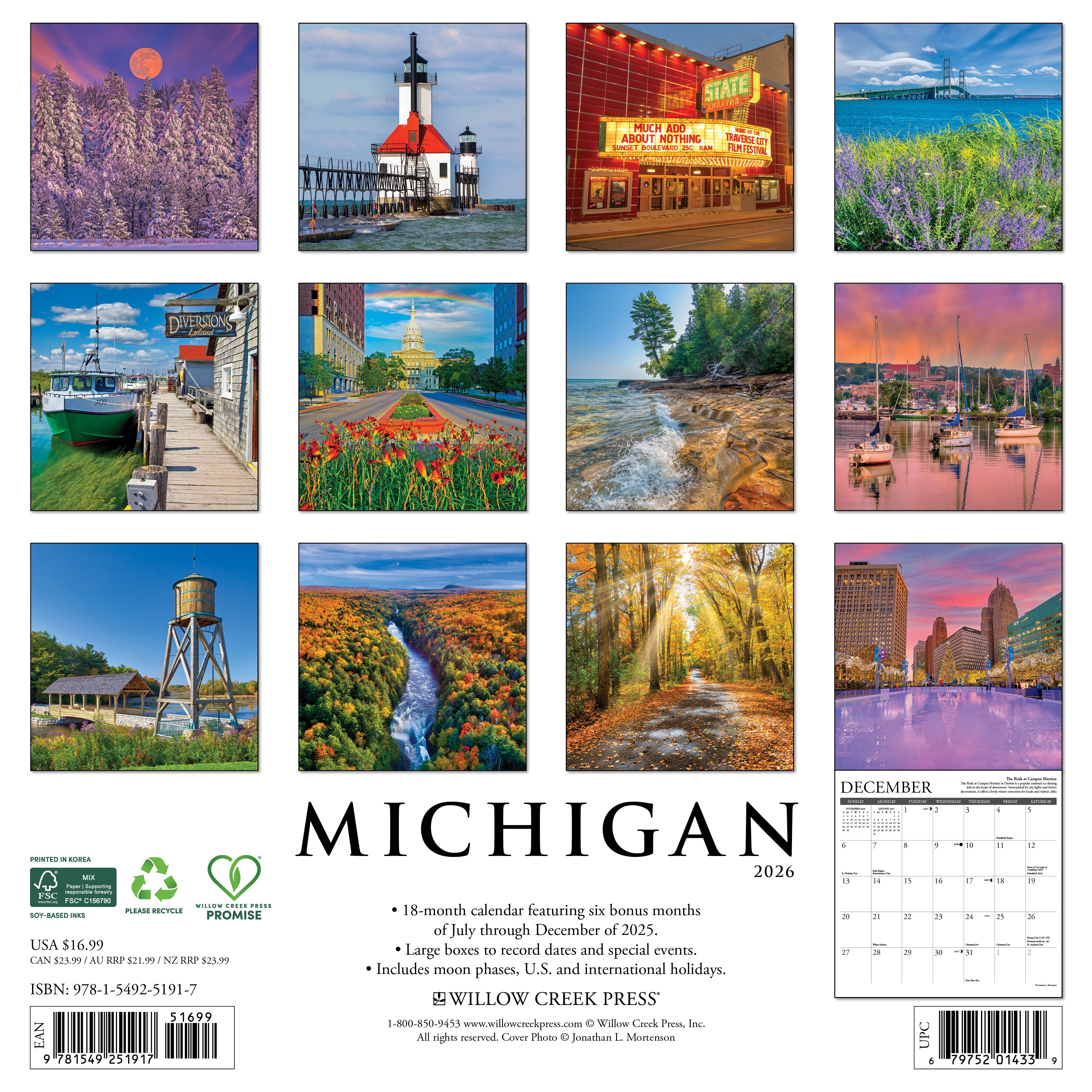 PURE PENINSULA BEAUTY – From snow-covered evergreens to golden autumn forests and iconic lakeside landmarks, this 2026 Michigan calendar captures the diverse charm of the Great Lakes State in every season. Let the natural beauty and cultural gems of Michigan brighten each month of your year.