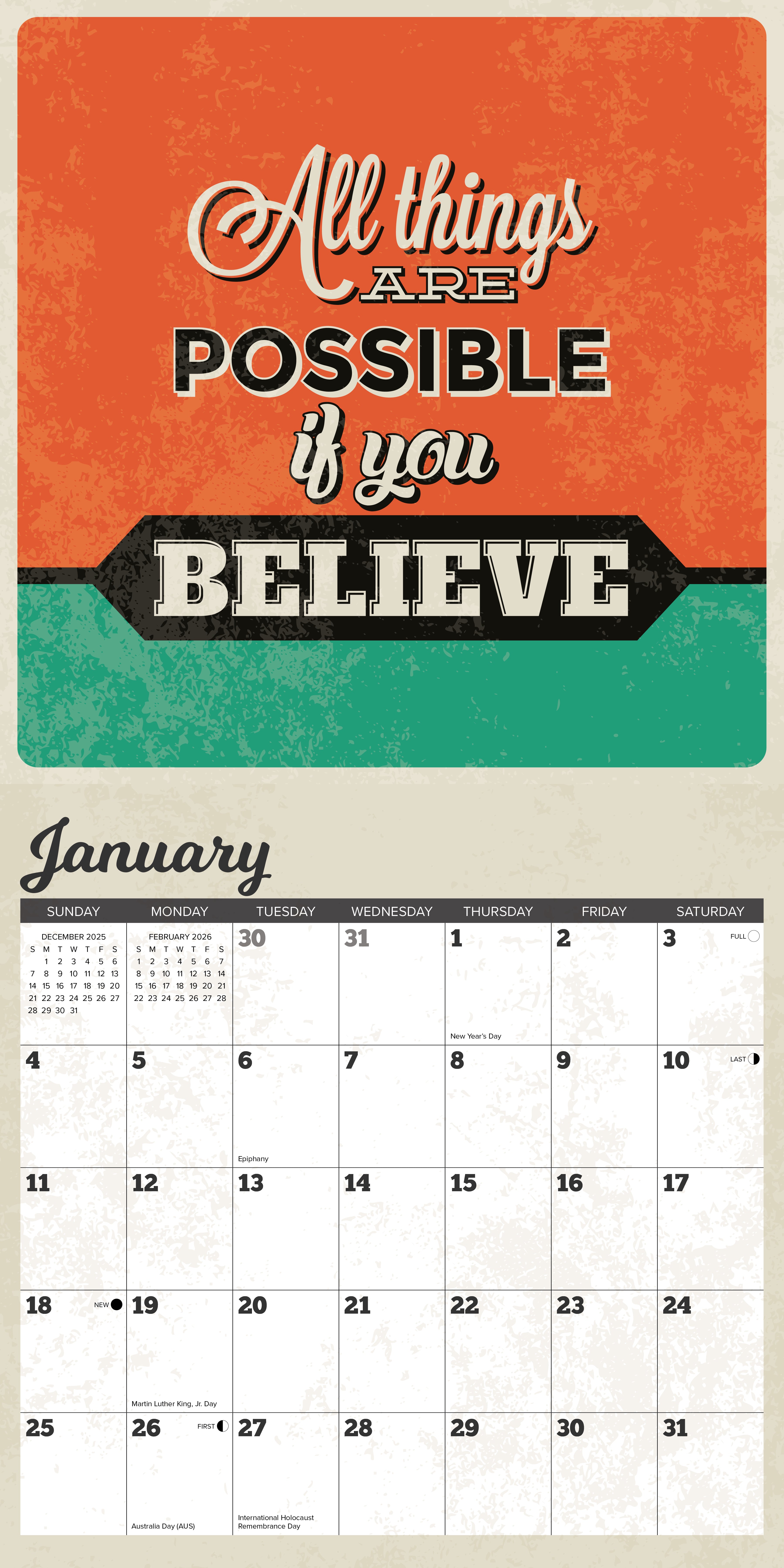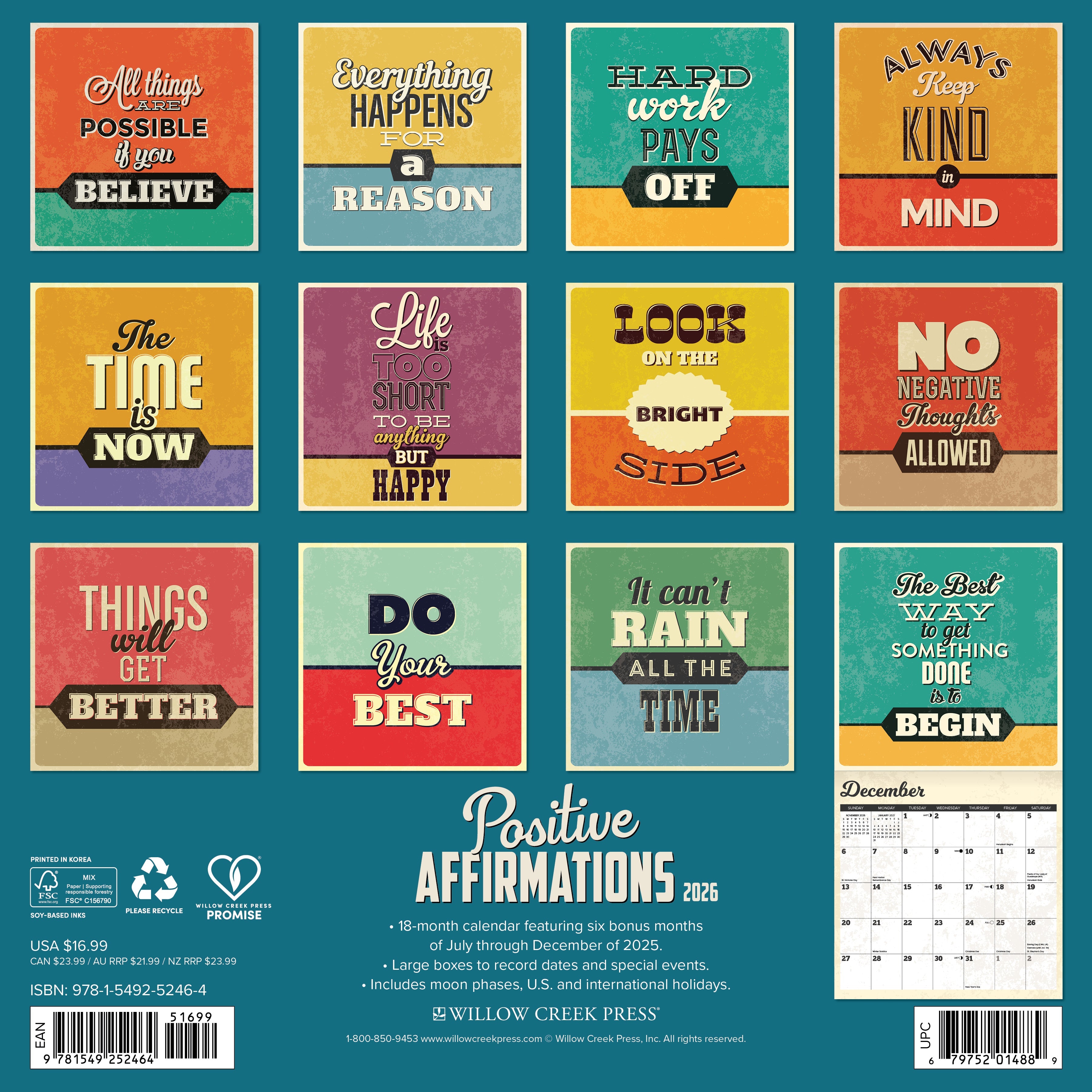 THE POWER OF POSITIVITY – With its retro-inspired design and vibrant colors, our 2026 Positive Affirmations 12" x 12" Wall Calendar will add a touch of nostalgic charm to any room. Its uplifting affirmations are carefully curated to inspire joy, confidence, and a renewed sense of purpose each month. Unlock the power of positivity and transform your mindset with a year-long journey of encouragement, motivation, and self-love.