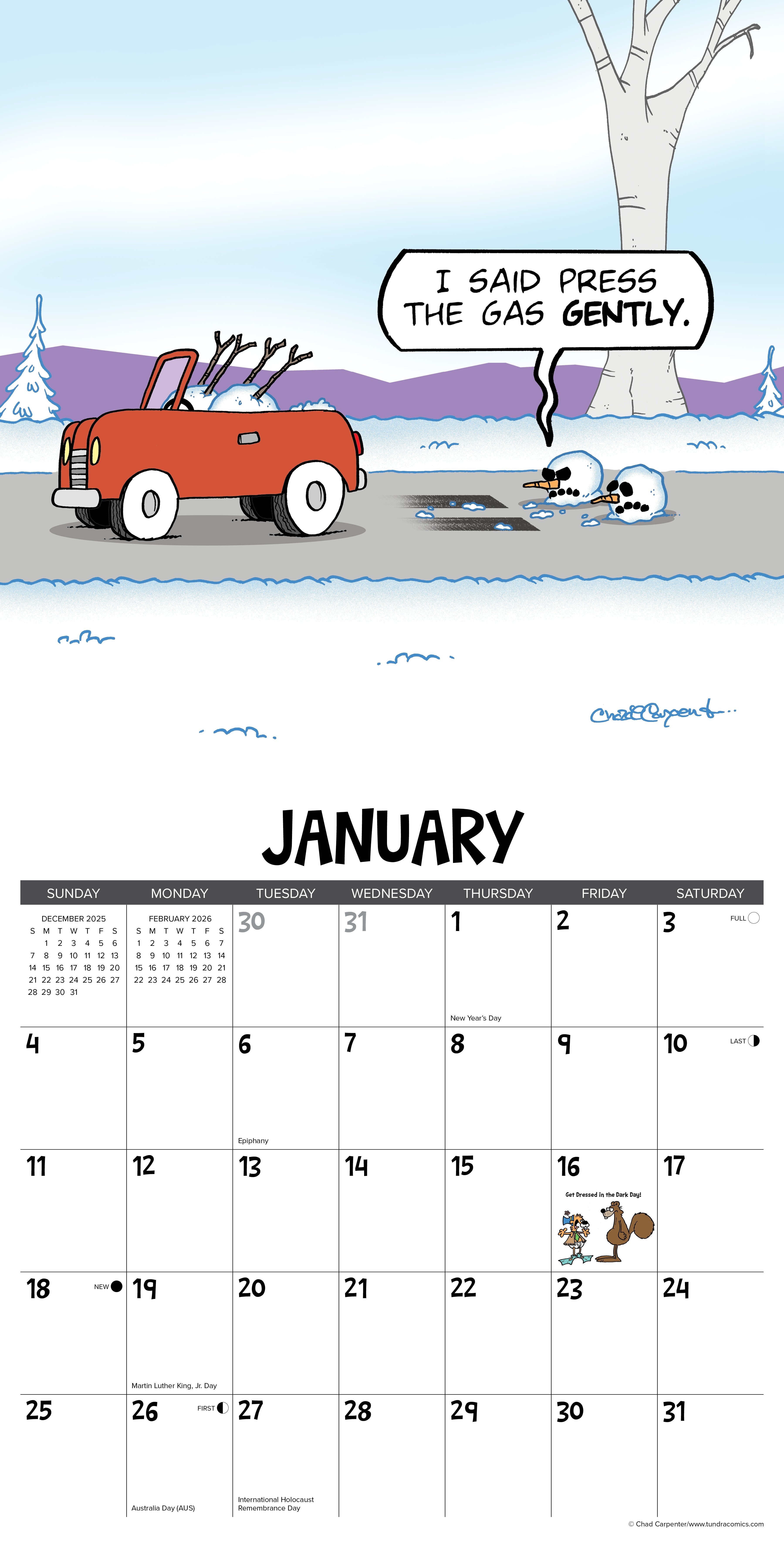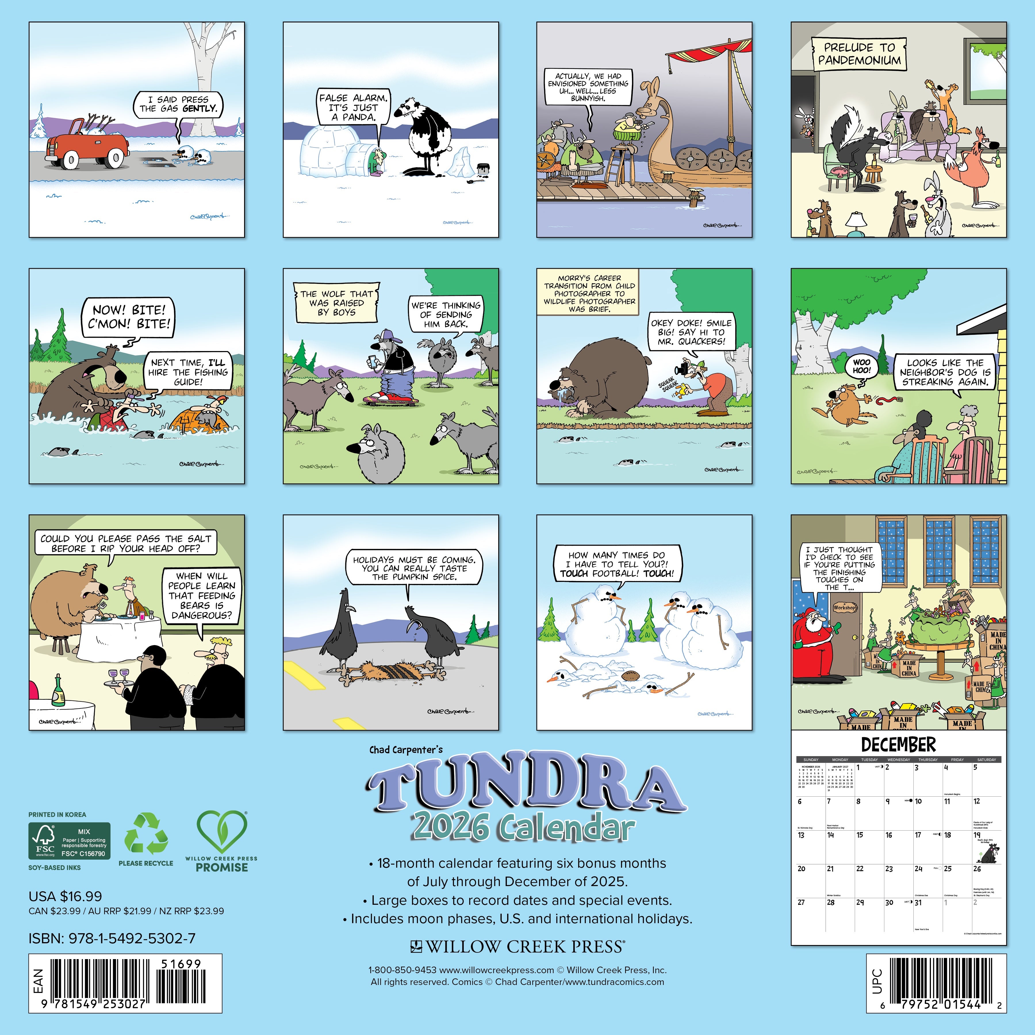 CARTOON CRAZE – The Tundra 2026 Calendar delivers a year of offbeat humor and laugh-out-loud moments from Chad Carpenter’s wildly popular comic strip. With quirky animals and hilarious wilderness antics, it's the perfect dose of daily comic relief.
