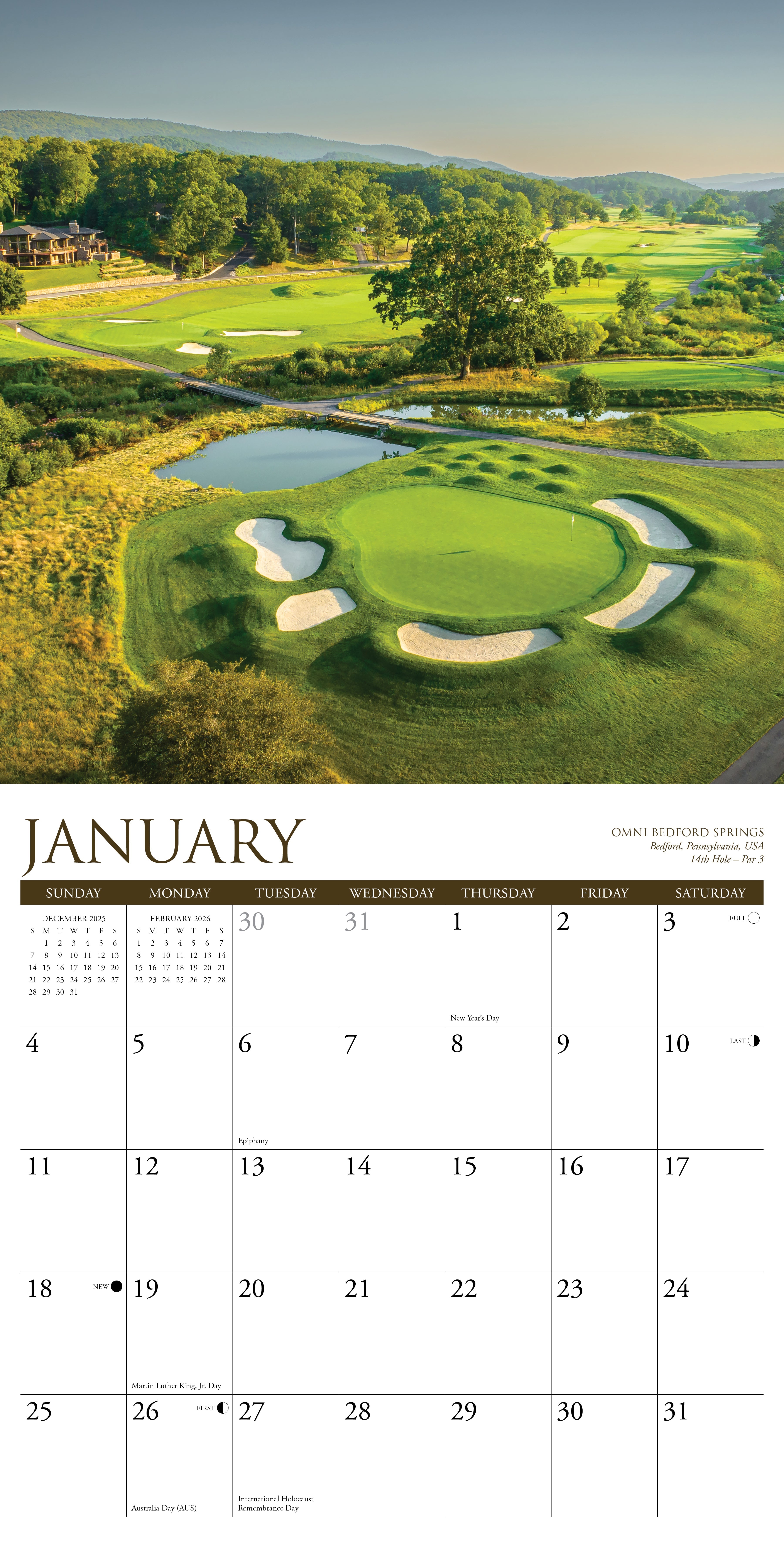 TEE OFF IN STYLE – Golf 2026 brings you a scenic tour of the world’s most stunning courses, from coastal links to mountain fairways, each captured in golden light and pristine condition. It’s the perfect calendar for golf lovers dreaming of their next round in paradise.