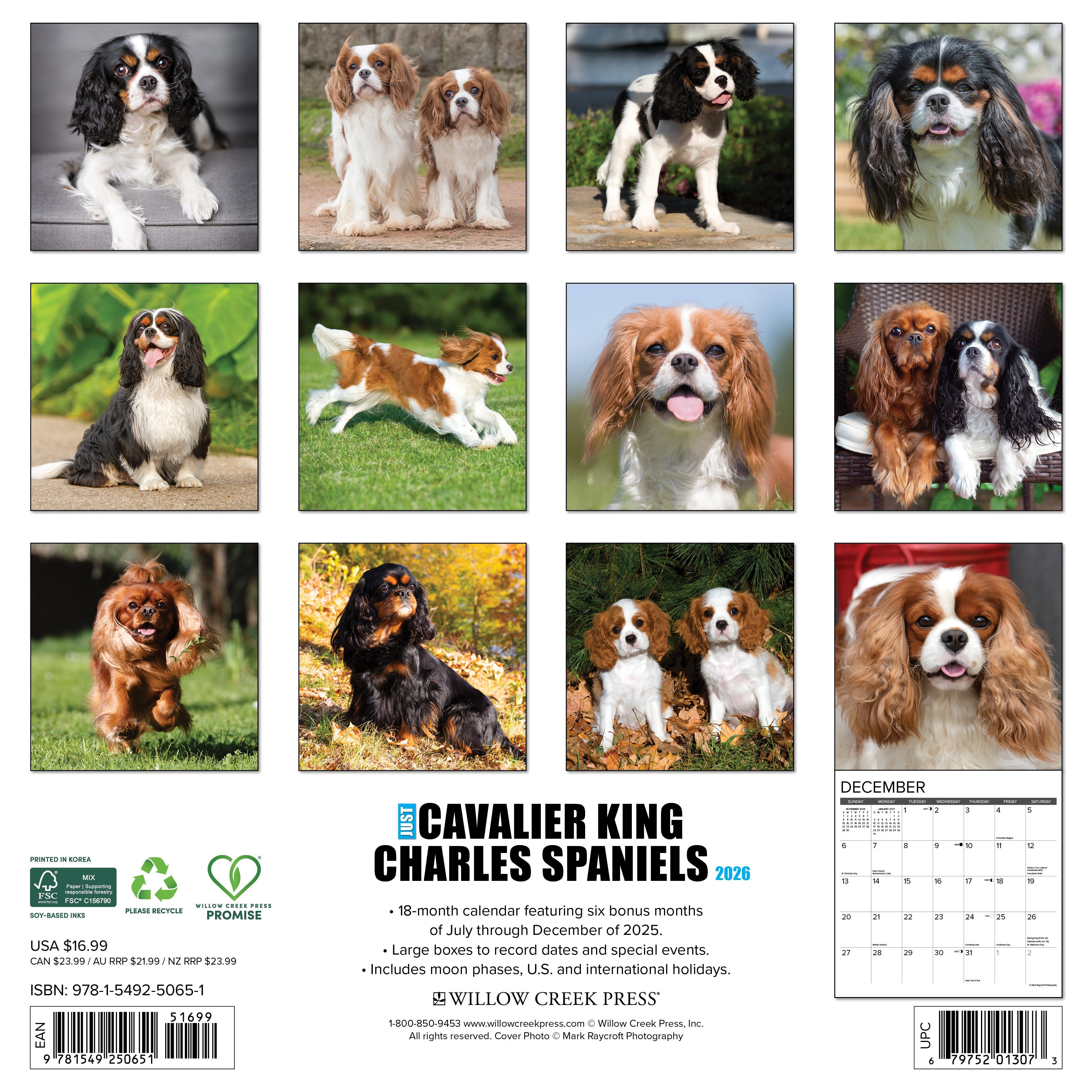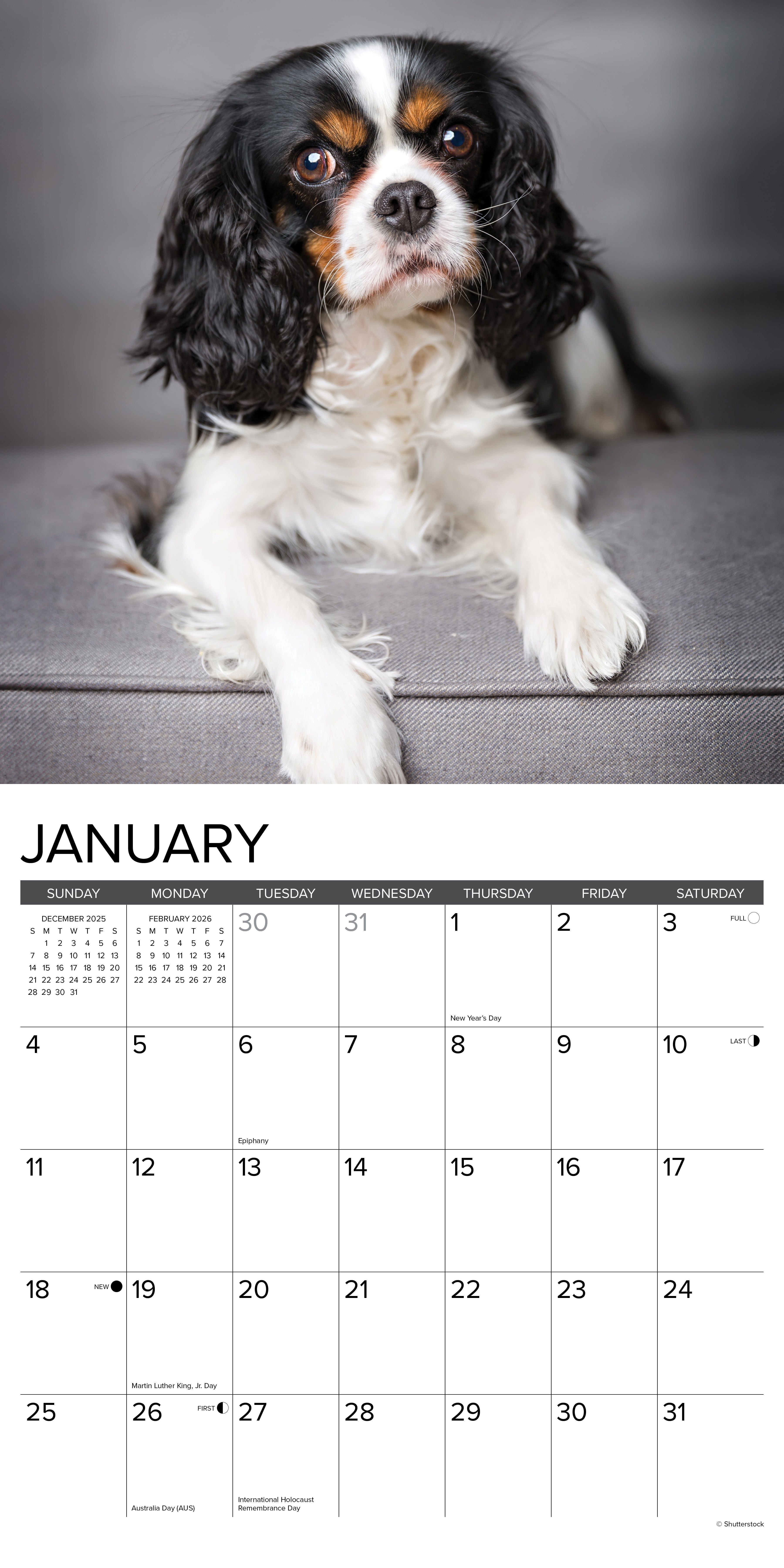 REGAL COMPANIONS – Celebrate the grace and gentle spirit of the beloved Cavalier King Charles Spaniel with this 2026 calendar, featuring stunning portraits of these affectionate and elegant dogs. Their sweet expressions and silky coats make every month a royal delight.