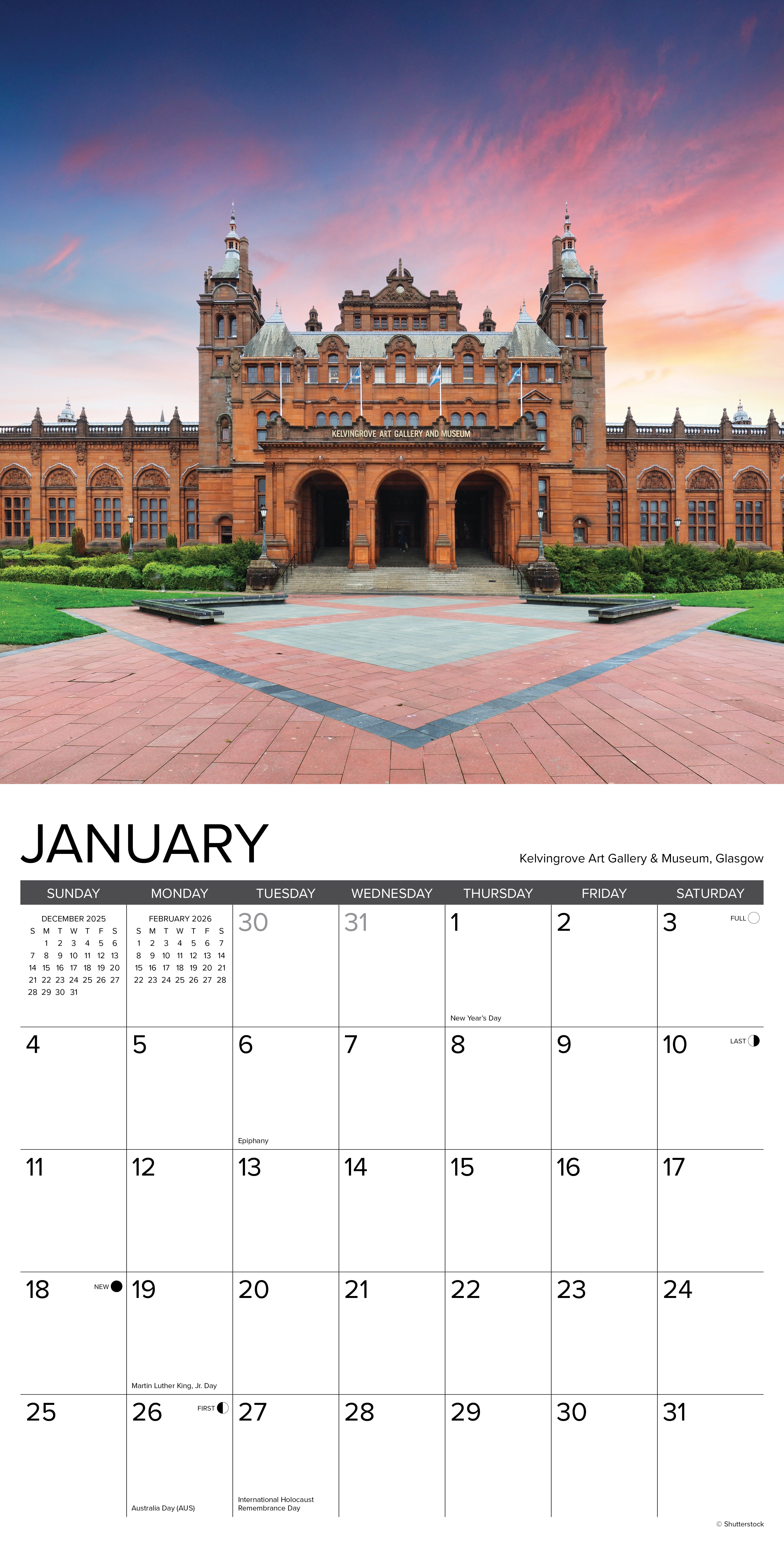 SCENIC SPLENDOR – Scotland 2026 showcases the rugged beauty, historic castles, and charming seaside towns of the Scottish Highlands and beyond. From puffins on coastal cliffs to misty mountains and iconic landmarks, this calendar captures the heart of Scotland's magic.